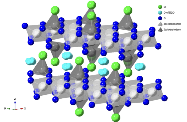 シモンコライトは、化学式Zn5​(OH)8​Cl2​・H2​Oで表される塩基性塩化亜鉛であり、自然界に存在する鉱物としても知られています。この物質が他の亜鉛化合物や抗菌素材と一線を画す最大の特長は、その特殊な「層状構造」にあります。シモンコライトは、原子が二次元的なシート状に配列し、その層が比較的弱い力で積み重なった結晶構造を有しています。